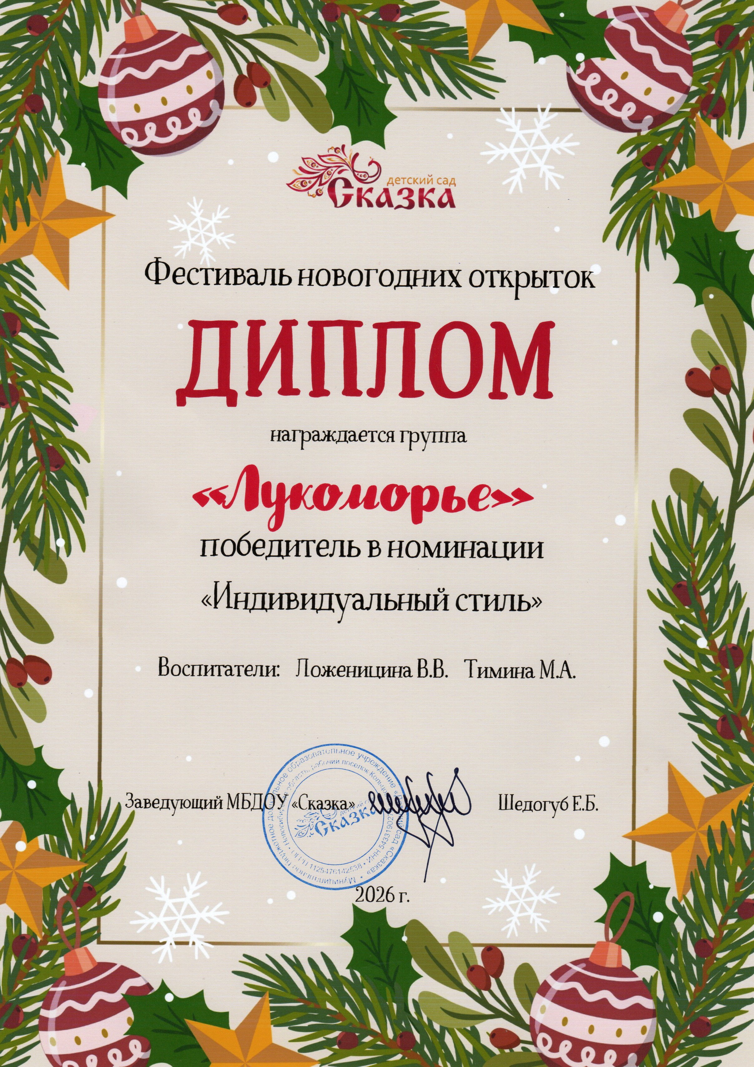 2026 год. Диплом победителя в номинации "Индивидуальный стиль" в Фестивале новогодних открыток